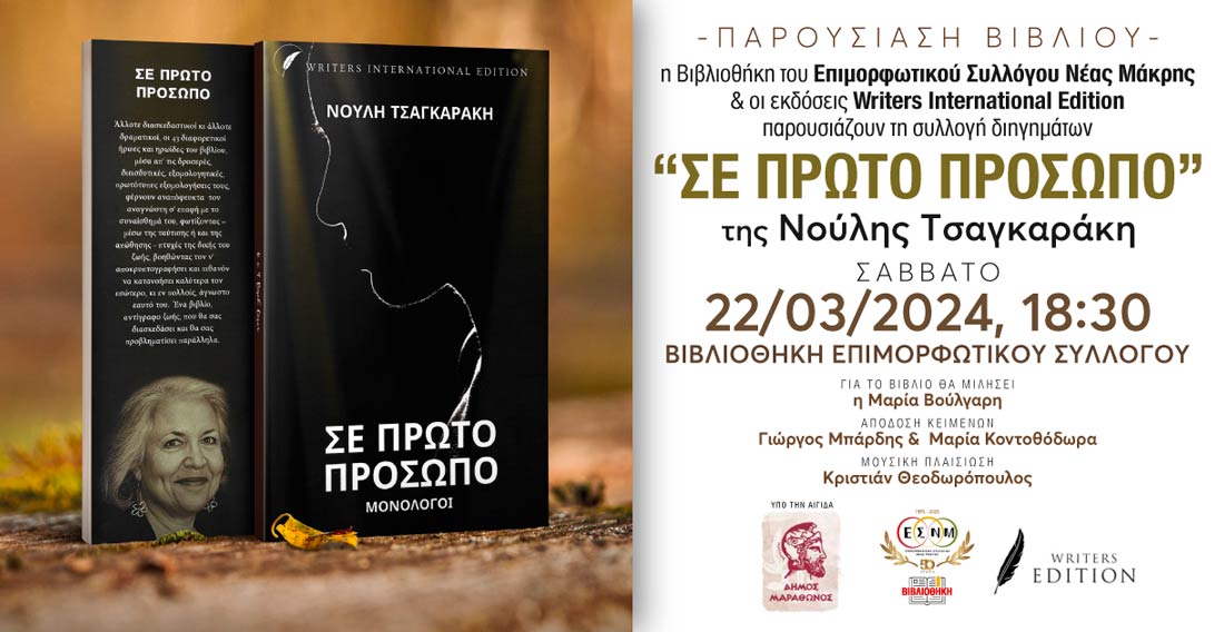Η Βιβλιοθήκη Επιμορφωτικού Συλλόγου Νέας Μάκρης και οι εκδόσεις Writers International Edition σας προσκαλούν στην παρουσίαση της συλλογής διηγημάτων της συγγραφέως και ποιήτριας ΝούληςΤσαγκαράκη με τίτλο: “Σε πρώτο πρόσωπο”. Η παρουσίαση θα γίνει το Σάββατο 22 Μαρτίου 2025, στις 18:30, στο χώρο της βιβλιοθήκης του Επιμορφωτικού Συλλόγου (Αθλητικό …