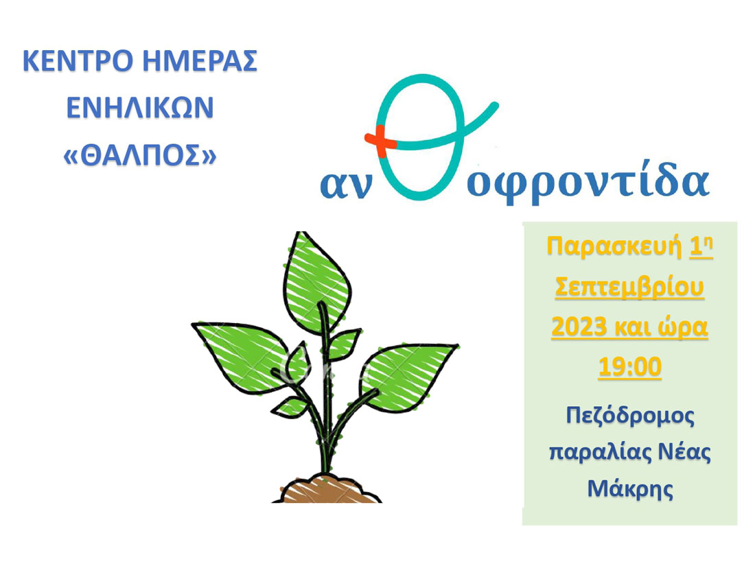 Το Κέντρο Ημέρας Ενηλίκων «Θάλπος» Δήμου Μαραθώνος σας προσκαλεί την Παρασκευή 1 Σεπτεμβρίου στις 19.00 στον πεζόδρομο της παραλίας Νέας Μάκρης στην εκδήλωση-βιωματική δράση «Ανθοφροντίδα», η οποία θα περιλαμβάνει βιωματικές δραστηριότητες, διαδραστικά παιχνίδια και ενασχόληση με τη φύση. Συγκεκριμένα, οι επιμέρους δραστηριότητες της δράσης θα αφορούν σε: …