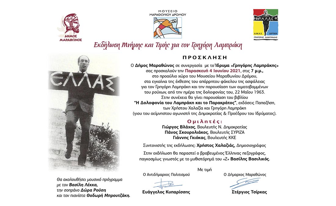 Εκδήλωση Μνήμης και Τιμής για τον Γρηγόρη Λαμπράκη την Παρασκευή 4 Ιουνίου στο Μουσείο Μαραθωνίου Δρόμου