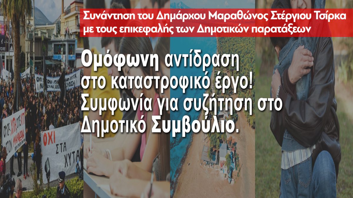 Την Πέμπτη 19 Σεπτεμβρίου 2019 με πρωτοβουλία του Δημάρχου Μαραθώνος Στέργιου Τσίρκα συγκλήθηκε συνάντηση με τους επικεφαλής των Δημοτικών παρατάξεων με θέμα «Το ΧΥΤΑ». Κατά τη συνάντηση εκφράστηκε η ομόφωνη αντίδραση όλων σε αυτό το καταστροφικό έργο και συμφωνήθηκε να …