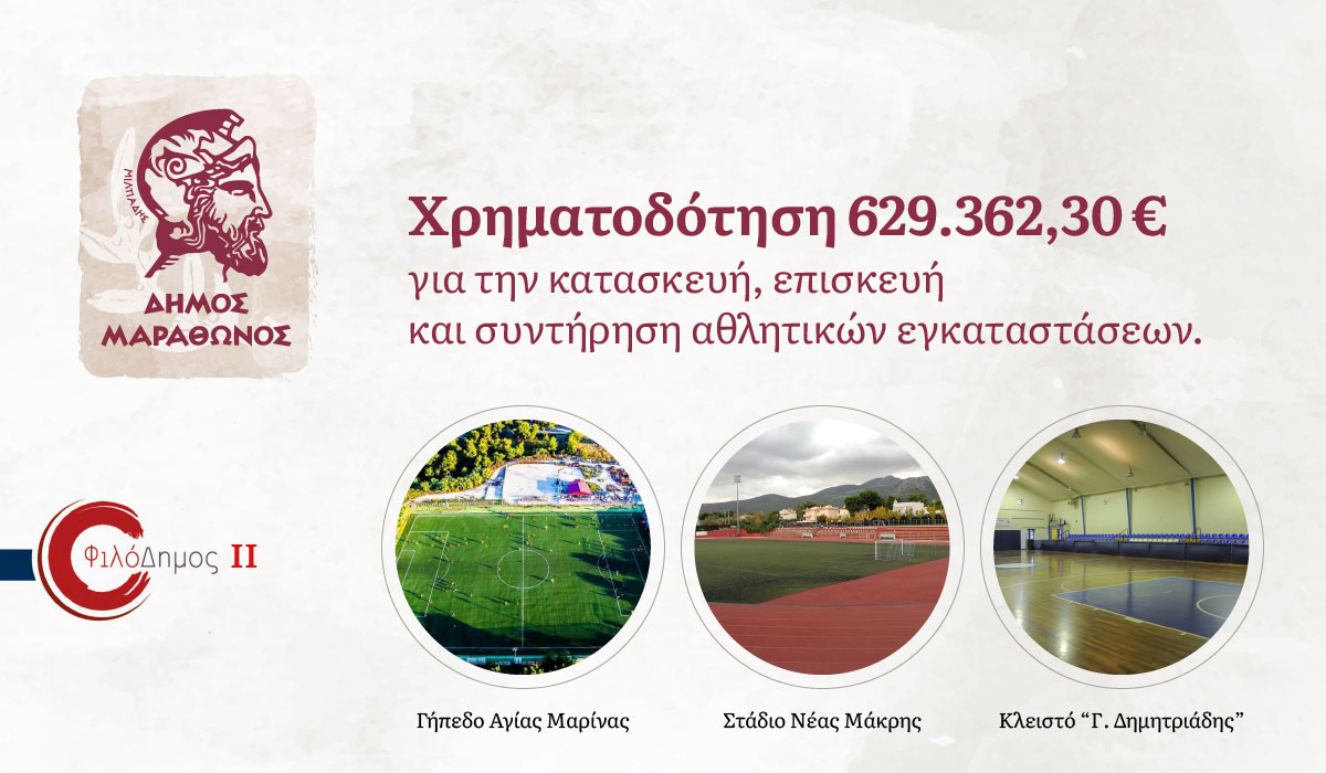 Εγκρίθηκε η χρηματοδότηση συνολικού προϋπολογισμού 629.362,30 ευρώ (συμπεριλαμβανομένου ΦΠΑ) στον Δήμο μας για την κατασκευή, επισκευή και συντήρηση αθλητικών εγκαταστάσεων του Δήμου Μαραθώνος, κατόπιν αιτήματος για την ένταξή μας στο Πρόγραμμα «ΦΙΛΟΔΗΜΟΣ ΙΙ». Συγκεκριμένα το ποσό του συνολικού προυπολογισμού αφορά : Στην συντήρηση του χλοοτάπητα …