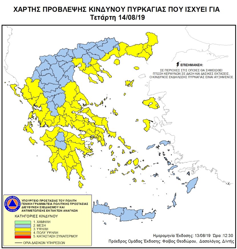 Ημερήσιος Χάρτης Πρόβλεψης Κινδύνου Πυρκαγιάς 14/08/2019